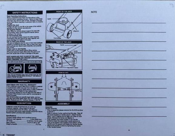 Craftsman Floor jack 3 ton model 950188. See pictures included a PDF of the exploded view very robust was my father’s. I don’t need 3 floor jacks. Thanks!