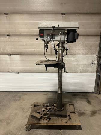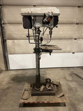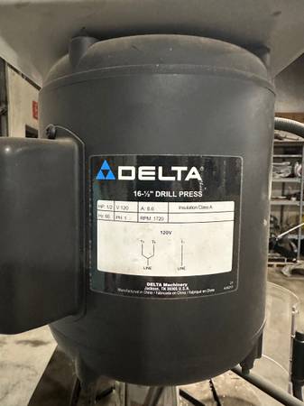 Delta 17-950L drill press, a model known for its 16.5-inch capacity and inclusion of a TwinLaser Crosshair system. The 17-950L has a 4-inch stroke and an 18" x 14" table.