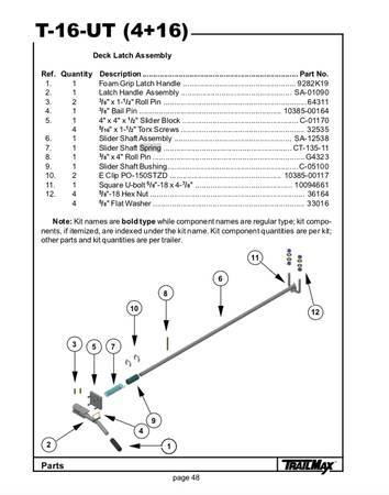 Page 48, T-16-UT Deck Latch Assembly 6 SA-12538. Slider Shaft - 4' stationary (TrailMax)