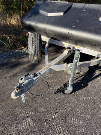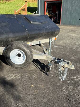 Aluminum 2 place snow machine trailer with reenforce fiberglass salt shield. High quality trailer in great condition. All lights work. LED and side running lights. Comes with two new spare tires on...