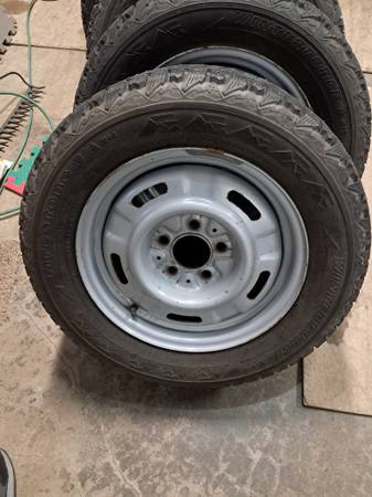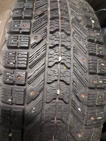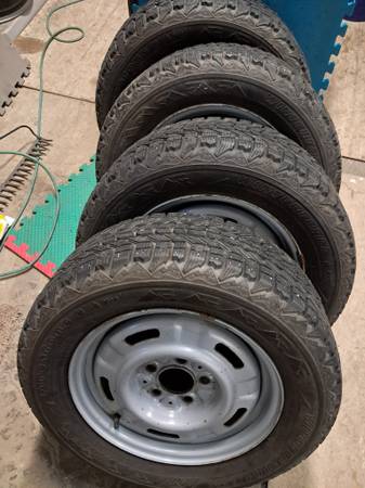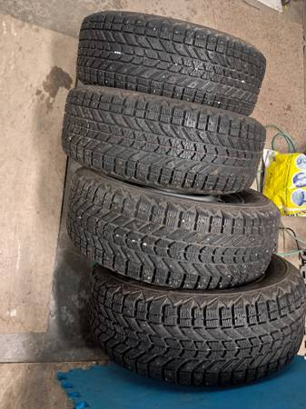 Older as is Firestone Winterforce snow and ice Studded tires 215/60/15 with estimated 90% tread life remaining and very good studs. Mounted on 5 by 115mm wheels, 6J wide, approximately 2 3/4 center hole. Used on an older Dodge Intrepid. $325 show contact info