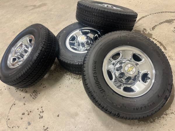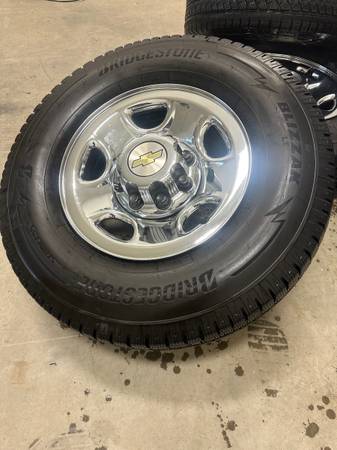 Set of Rims and tires like new condition 8 lug . Bolt pattern 8x165.1 Tires have very low miles , they are Blizzaks winter studdless. Stored always inside.