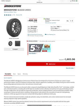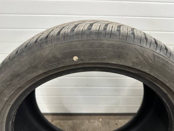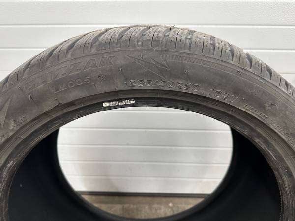 Near new set of staggered Bridgestone Blizzak LM05 studless winter tires. 2 tires @ 285/40R20 and 2 @ 255/45R20. Only used for part of one season. No plugs or patches. Hard to find sizes, had to have them shipped up. Ended up getting some 19” wheels for winter.